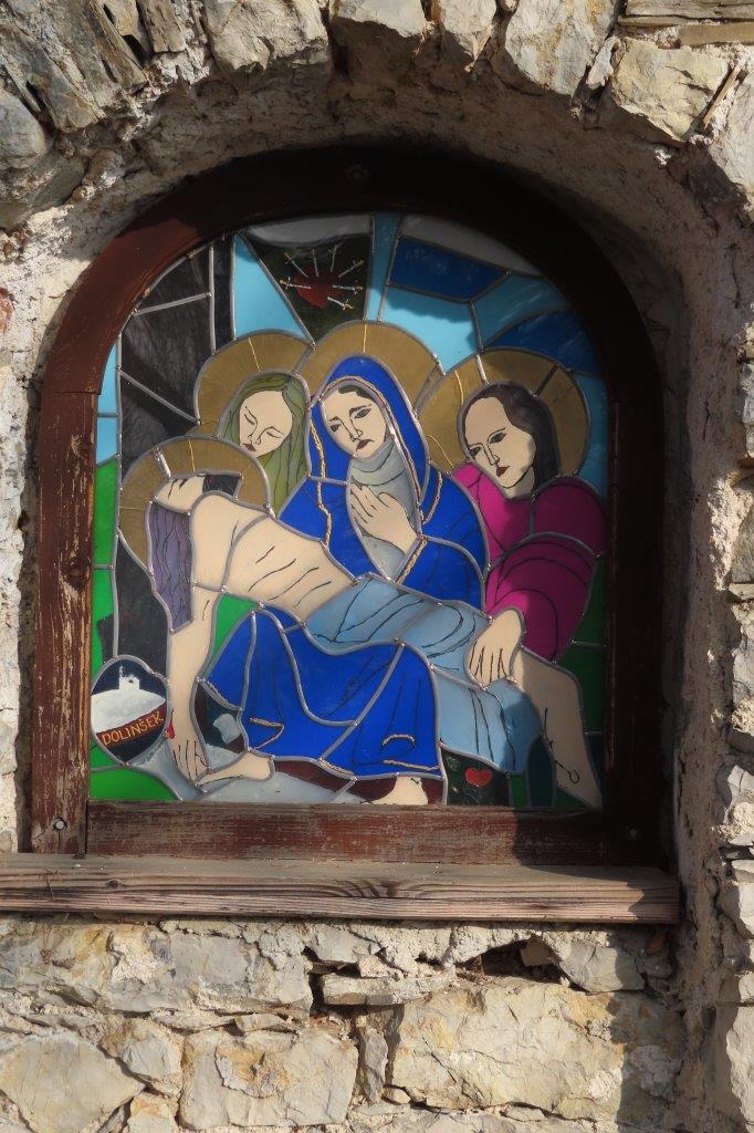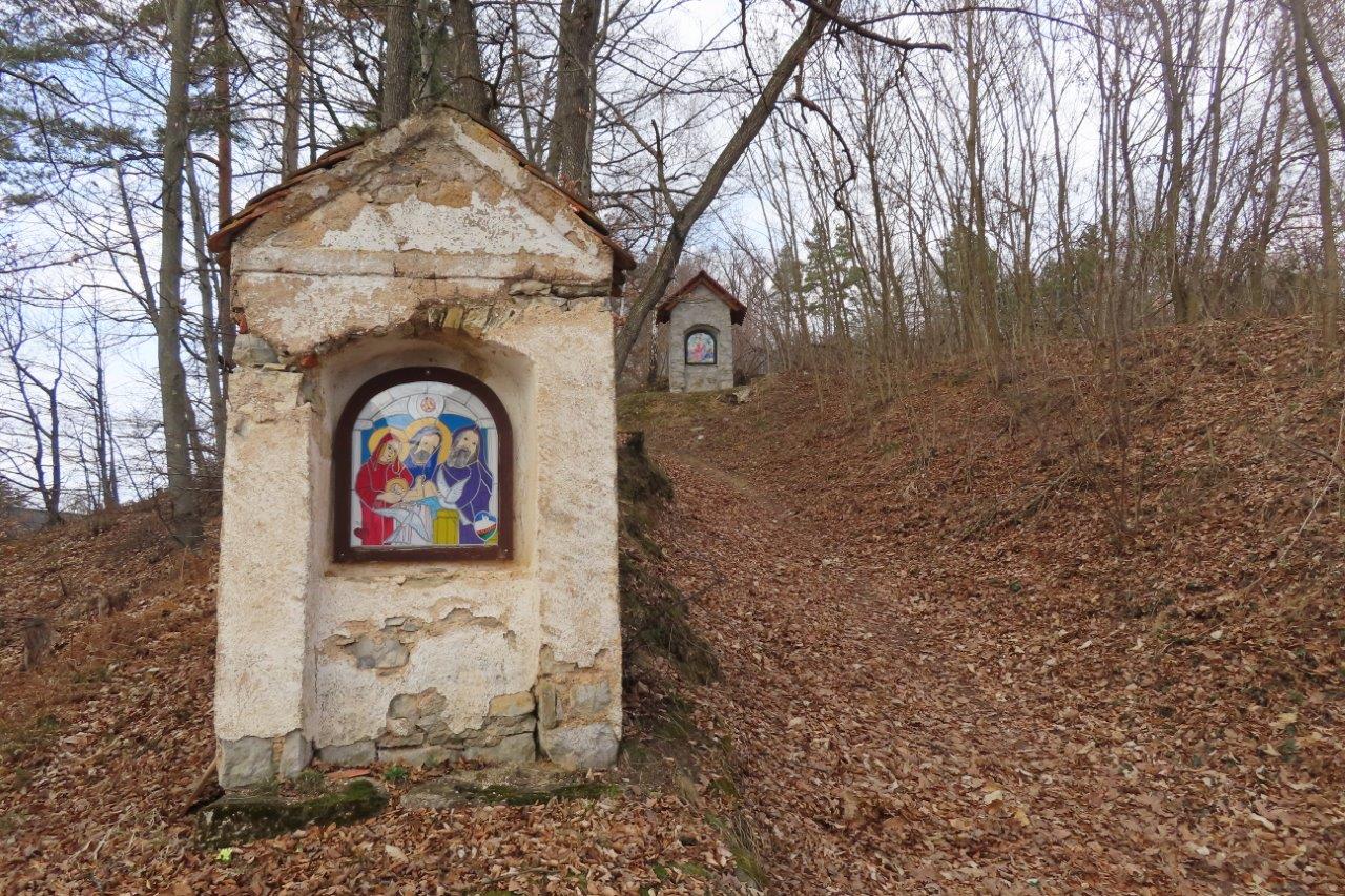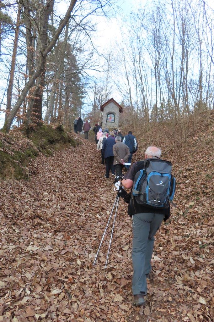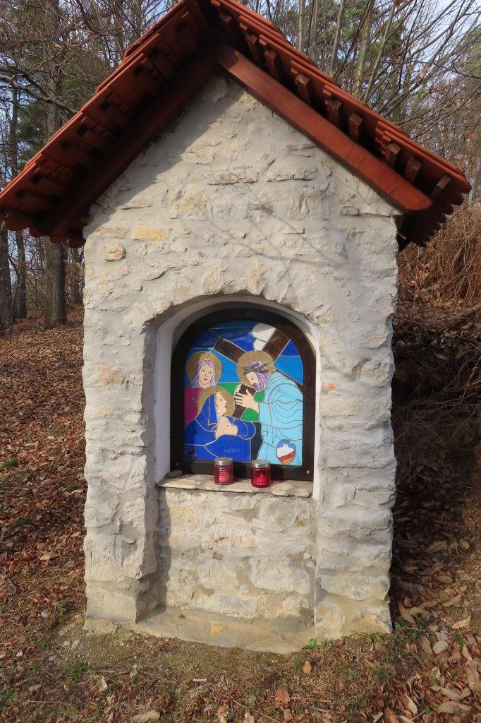 Ob poti z Vrha na Topolovec smo se ustavili pri vsaki izmed sedmih zidanih kapelic, ki upodabljajo sedem Marijinih žalosti. Kapelice, pokrite z lepo obnovljenimi opečnatimi strehami, bogatijo poslikave na steklu – vitraži – sevniškega umetnika Rudija Stoparja. Prikazujejo: (i) Jezusovo rojstvo, (ii) beg v Egipt, (iii) Jezusa v templju, (iv) srečanje Jezusa z Marijo na križevem potu, (v) Marijo in apostola Janeza pod križem, (vi) žalostno Mater ob snemanju Jezusa s križa ter (vii) polaganje Jezusa v grob. Do vrha hriba smo skupaj prebrali Križev pot redovnice Jane Rovtar in ter ob premišljevanju o Jezusovem in Marijinem trpljenju iskreno razmišljali tudi o svojih odzivih na preizkušnje in težave, s katerimi se srečujemo v vsakdanjem življenju.