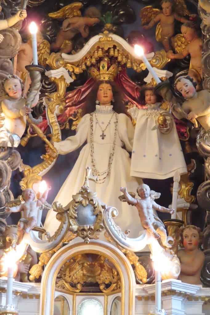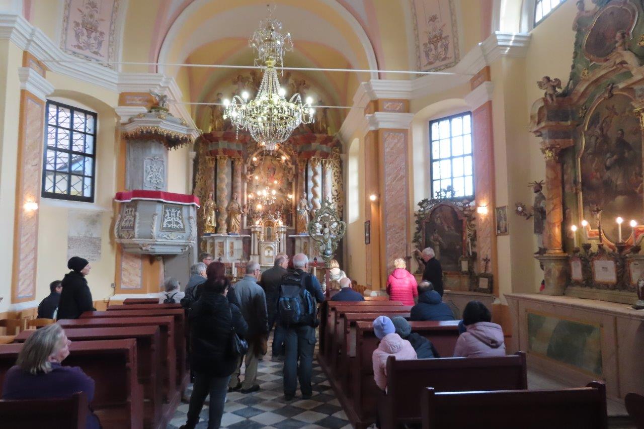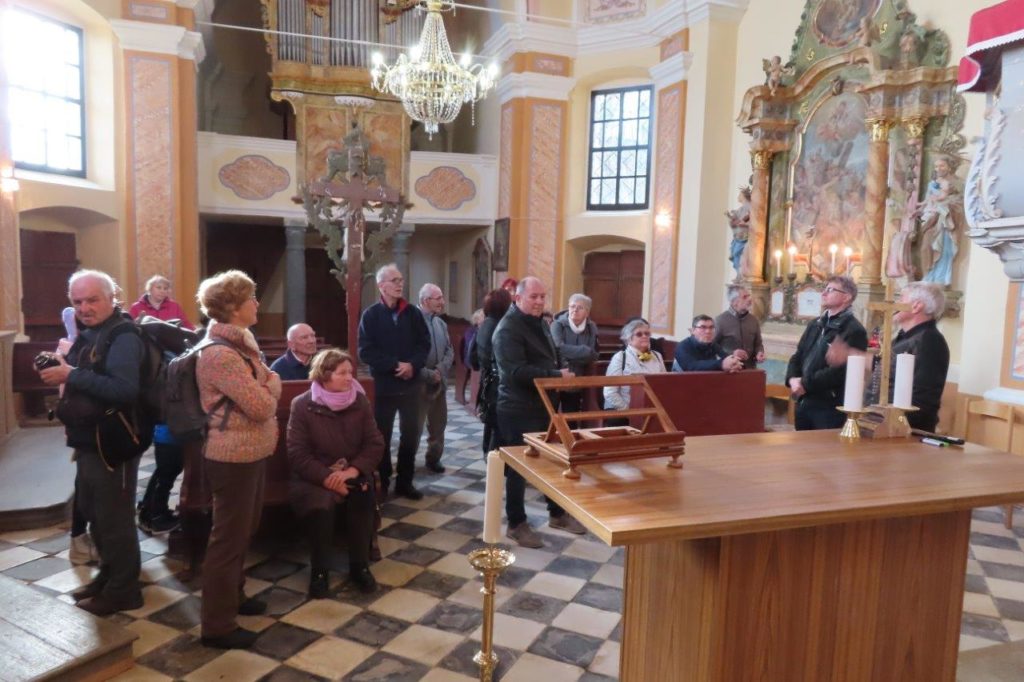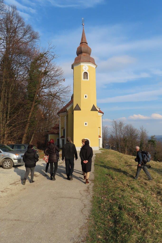 Na vrhu smo občudovali lepo obnovljeno cerkev in prisluhnili gospodu ključarju, ki nam je prijazno predstavil njeno zgodovino in notranjost. Cerkev je leta 1734 dal zgraditi boštanjski graščak v zahvalo za ozdravitev svojega hudo bolnega otroka. Danes je obnovljena in predstavlja ponos kraja. Nekoč so romarji prihajali v velikih procesijah; še pred drugo svetovno vojno so na predvečer praznika prispeli že zvečer, noč pa prečuli ali prespali v cerkvi in njeni okolici. Takšnih množičnih shodov danes ni več, vendar je svetišče nekajkrat na leto še vedno polno življenja. Obiskovalce vedno znova očara tudi čudovit razgled po dolenjski in štajerski pokrajini.